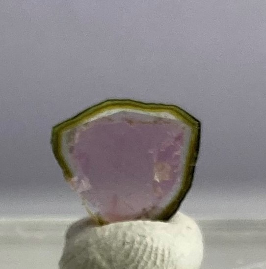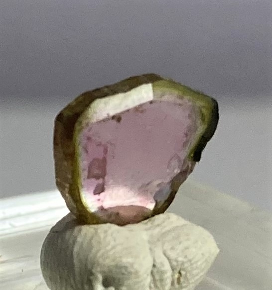 Wassermelonenturmalin aus Madagaskar. Kleine Scheibe – geschnitten und beide Seiten poliert. Gewicht der kleinen Scheibe ungefähr 0,25 Gramm.