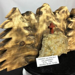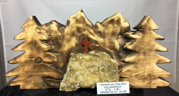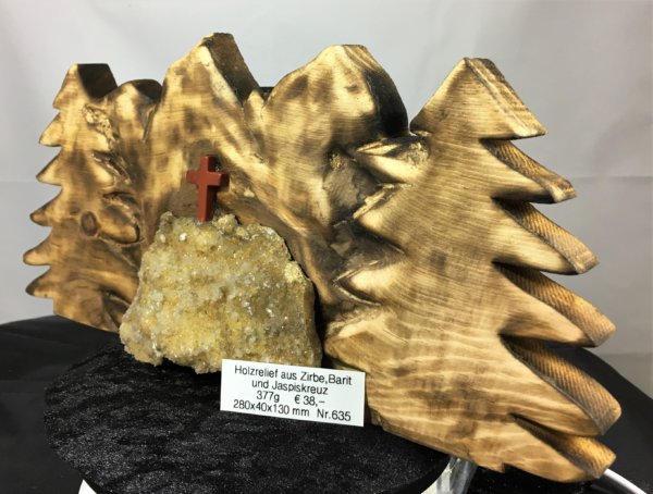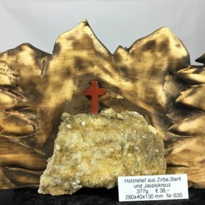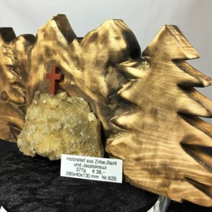 Holzrelief aus Zirbenholz geschnitzt mit Baryt und Jaspis Kreuz. Aus eigener Werkstatt.